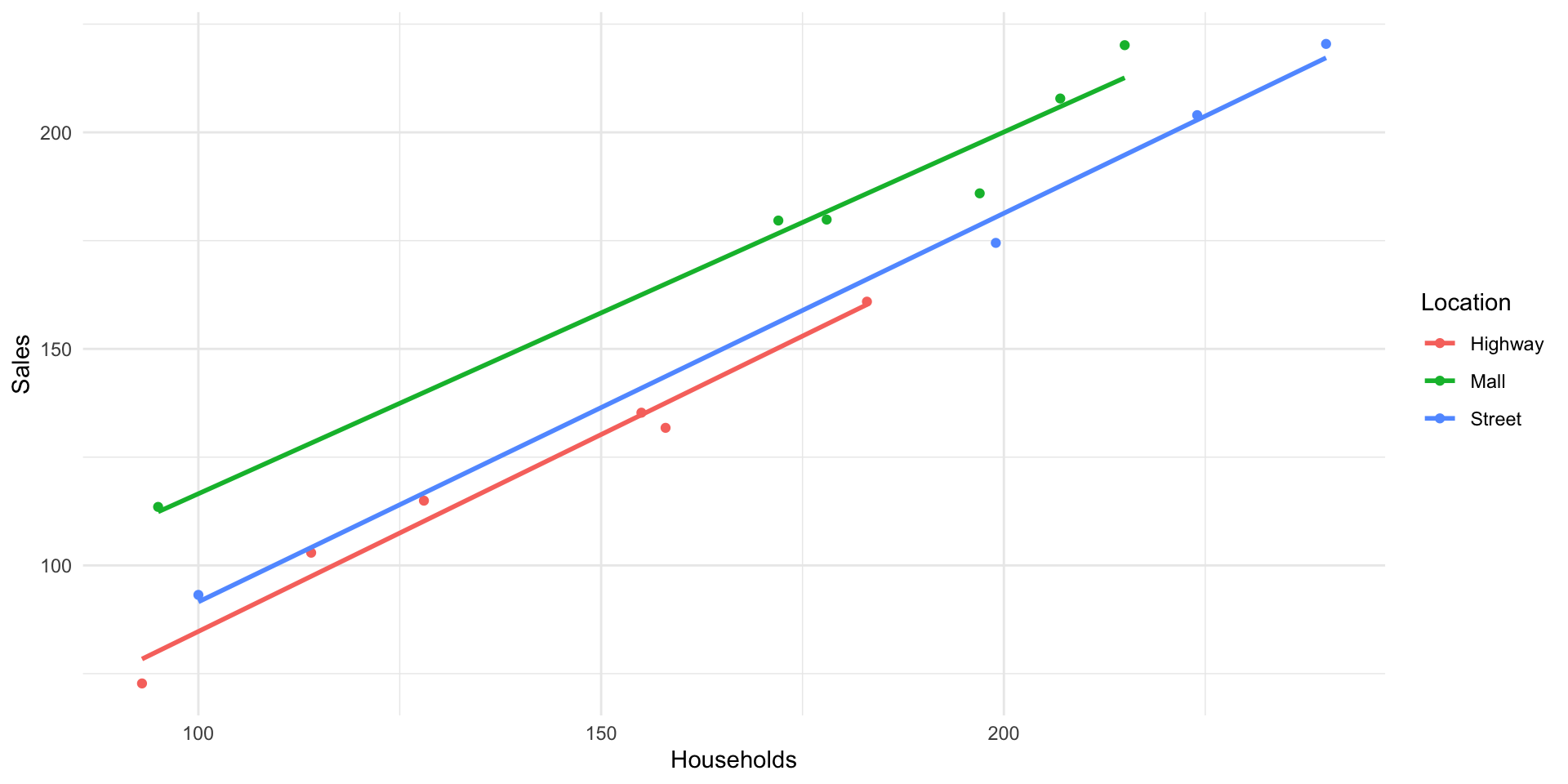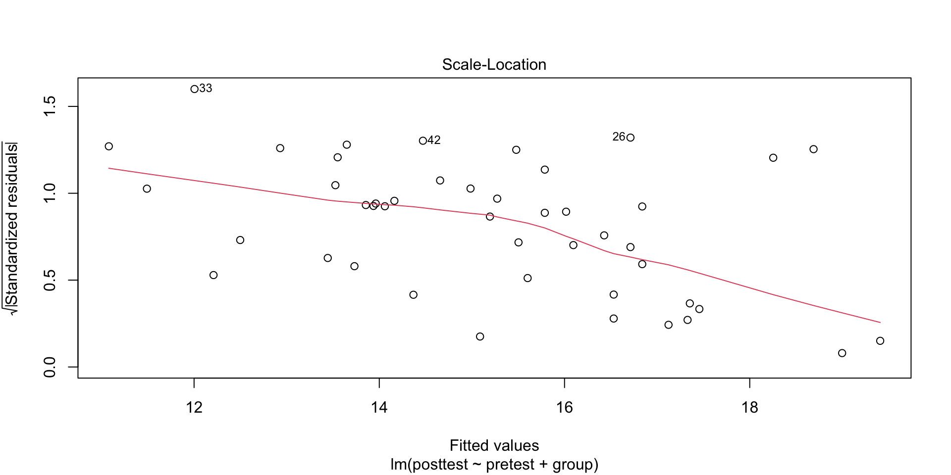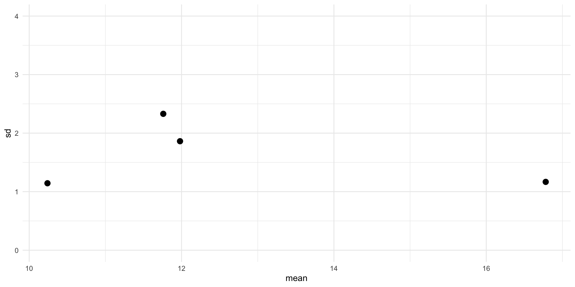 If the assumptions were valid, we would expect the four points to fall approximately along a horizontal band indicating constant standard deviations, and hence variances, regardless of the means of the groups.