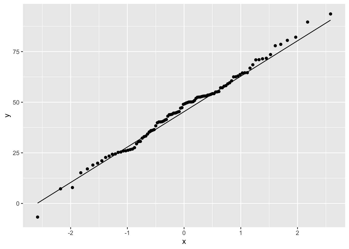There is very often some departure in the ‘tails’ at either end in real data. Here’s a plot of data that were actually simulated from a normal distribution for comparison: