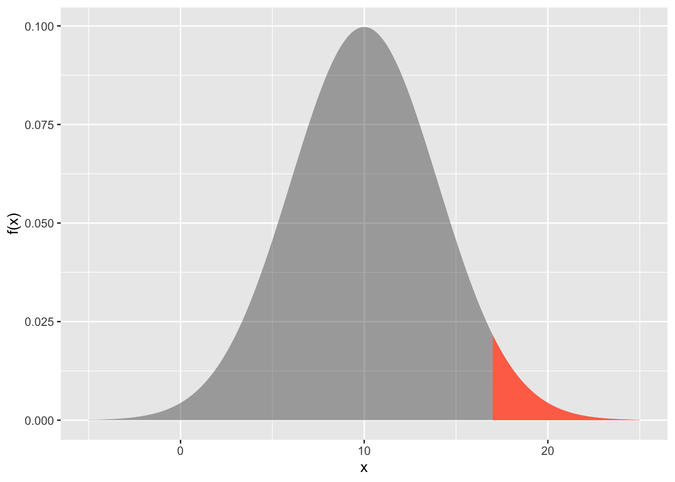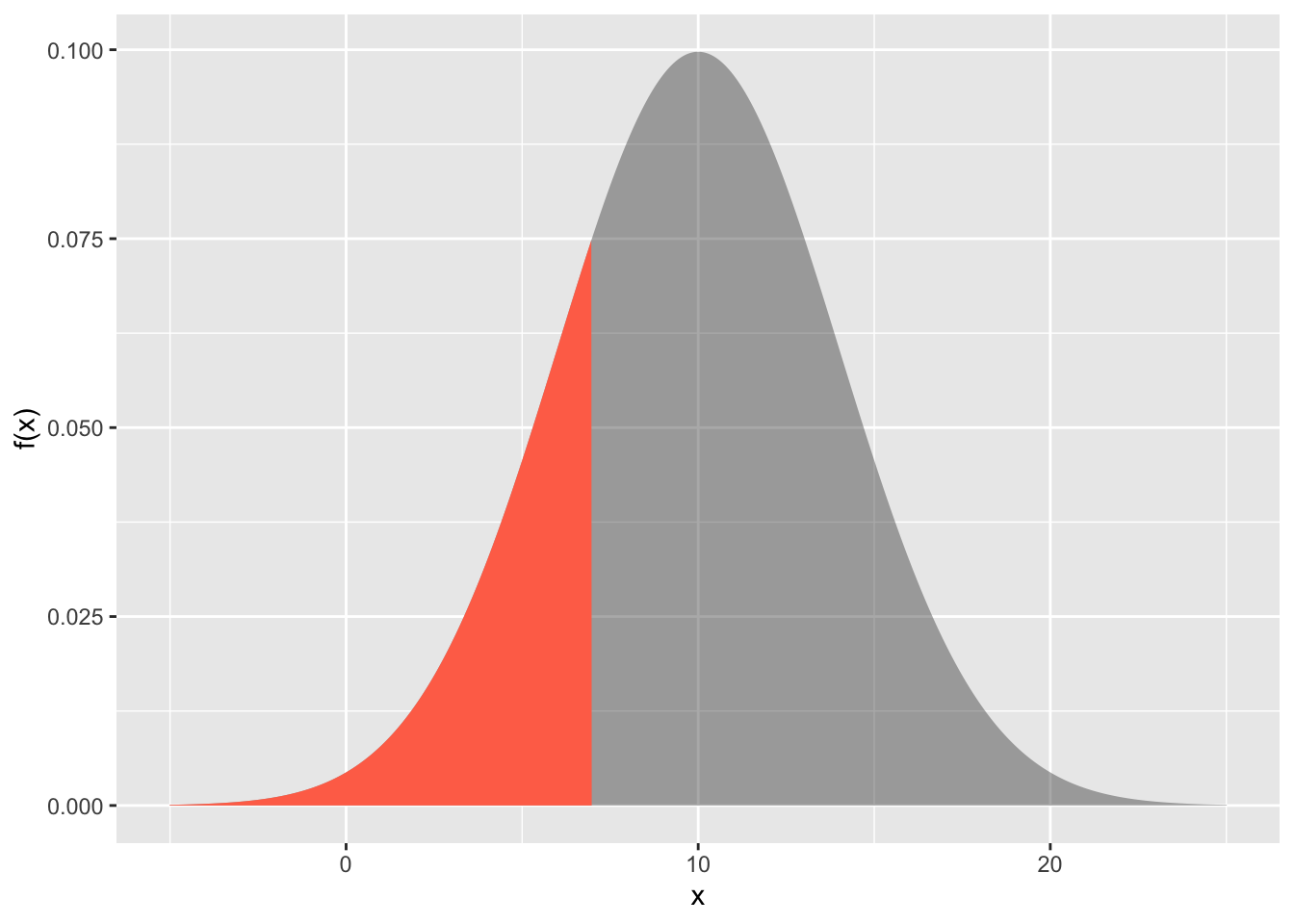 We get this by subtracting the coral area, `pnorm(8.4, 10, 4)` (right figure), from the blue area, `pnorm(15.7, 10, 4)` (middle figure).